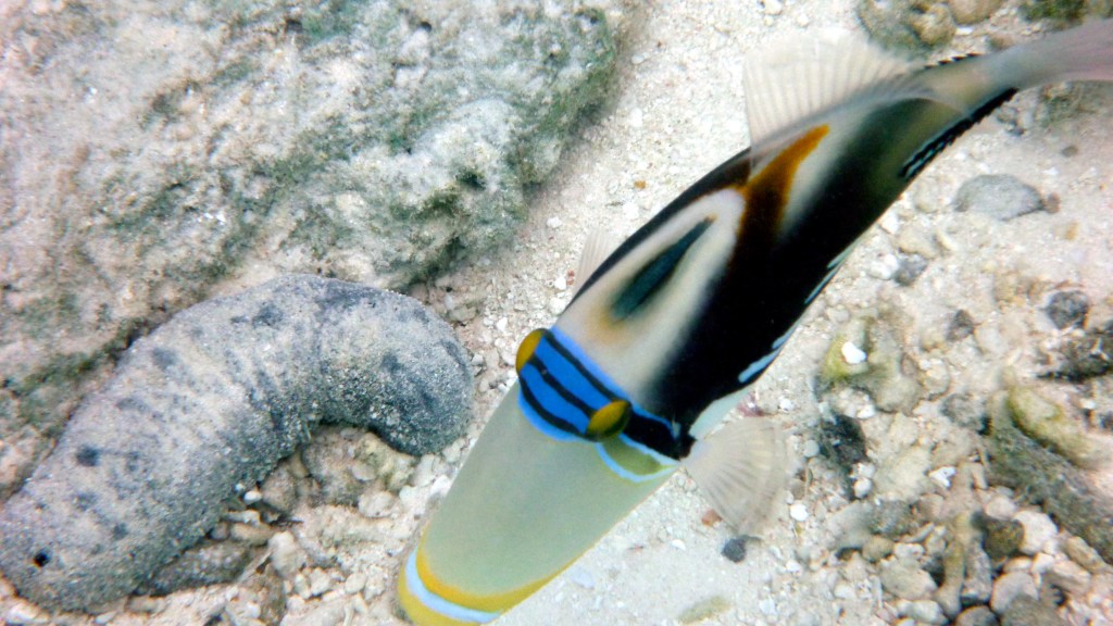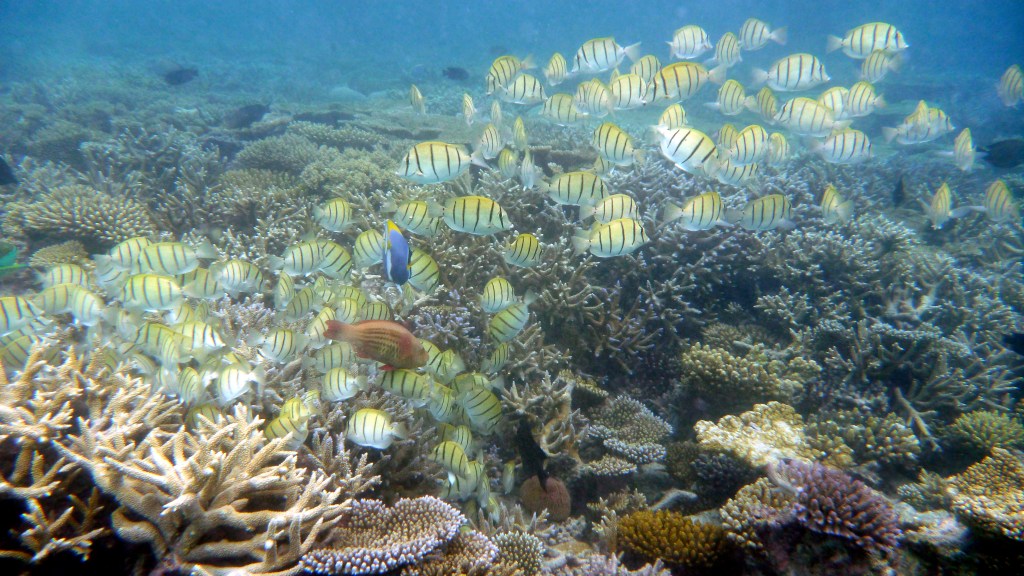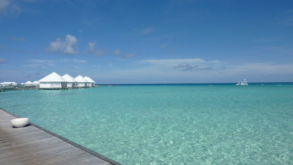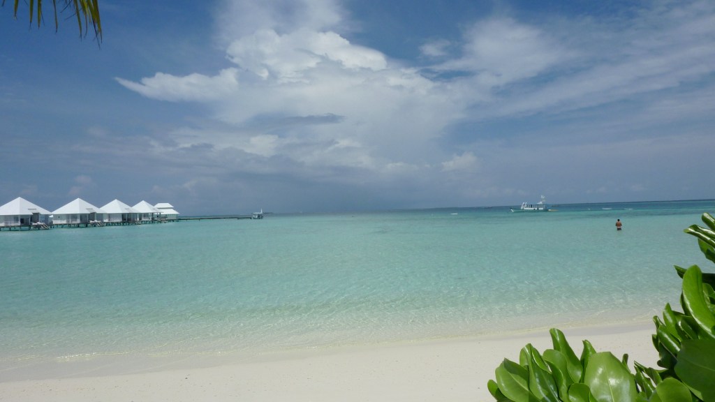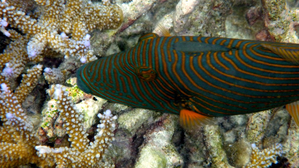 Il mare è di una bellezza indescrivibile: trasparente e calmo come una piscina nella splendida laguna e azzurro e profondo oltre il reef. La barriera anche qui ha risentito del “Niño”: i colori sono spenti ma la quantità di pesci bilancia questa carenza. In mare, infatti, si è attorniati da una quantità di fantastici pesci coloratissimi, dalle mille sfumature e forme. Tra i tanti, noi abbiamo visto squali grigi di barriera, uno splendido squalo pinna bianca, tartarughe marine, murene, razze, aquile di mare e delle mobule (simili alle mante). E tutto semplicemente facendo snorkeling intorno a questo paradiso fantastico che prende il nome di Athuruga.